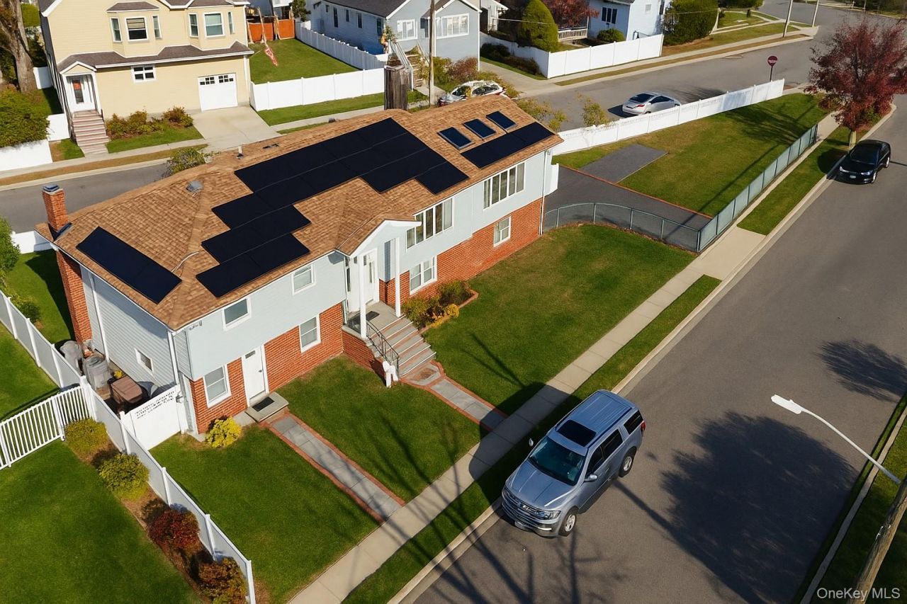 OPPORTUNITY KNOCKS! This spacious, sun-filled High Ranch on a beautifully landscaped corner property offers a potential mother/daughter setup (with proper permits)-perfect for extended families, multi-generational living, or flexible use of space. Featuring four bedrooms, 2.5 baths, and a 2-car garage, this home includes an updated kitchen with granite countertops and a center island, a bright main-level living room, and an updated ground level with additional bedrooms, a full bath, and a second living area with direct walkout access to a fully fenced yard-ideal for entertaining or relaxing outdoors. Enjoy your mornings with beautiful sunrises from the extended deck overlooking the lush backyard. Energy-efficient leased solar panels ($204/month) help keep utility costs low. The home is equipped with a whole-house water filtration and conditioning system, including a sediment/carbon pre-filter and Reionator hybrid water softener, as well as a brand-new Blue Max sediment pre-filter and Pro Conditioner, which deliver soft, chlorine-free, high-quality water throughout. Located close to beaches, Shell Creek Park, restaurants, shops, and the LIRR, this home combines comfort, privacy, and modern sustainability in one perfect package. Sold as is. Excluded: window A/C units.